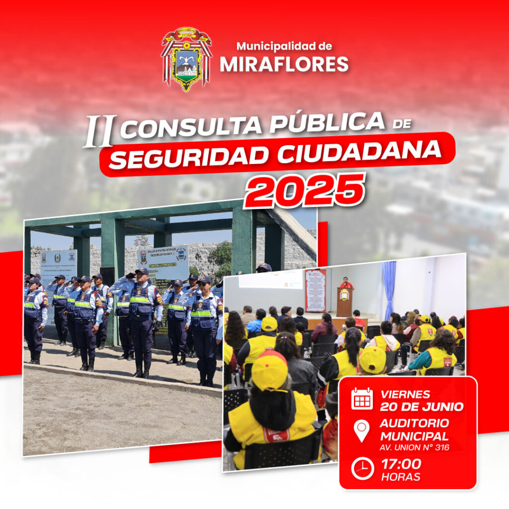 La Municipalidad de Miraflores invita a todos los vecinos y vecinas a participar en la II Consulta Pública de Seguridad Ciudadana 2025, un espacio de diálogo abierto para escuchar tus propuestas y construir juntos un distrito más seguro.